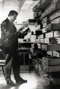 Der deutsch-schwedische Schriftsteller Peter Weiss (1916–1982) vor seinem Archivschrank in der Stockholmer Wohnung, 1966. © Foto: Carlo Bavagnoli / Shutterstock.com
